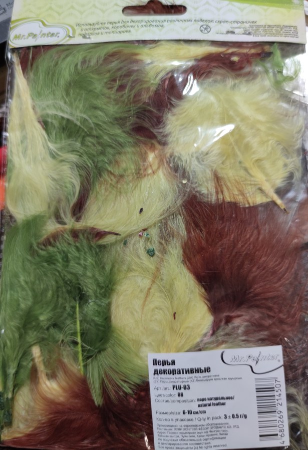 | Краткое описание | PLU-03 - это окрашенные перья индейки. Пух расположен только вдоль стержня пера, основное тело пера - это тонкие ворсинки. Перышки небольшие, плоские, тонкие пуховые ворсинки пера образуют форму круга. Идеальны для скрап-страничек и оформления подарков, так как хорошо сочетаются с другими элементами - такие как шармы или бумажные цветочки. Могут быть использованы для создания украшений. Так как перо натуральное, в пачке допускается наличие перьев с различными размерами, с нарушением ровности пуха, наличие заломов, согнутых перьев. Размер перьев - 6-10 см. В одной розничной пачке 3 г ± 0.5 г перьев. |